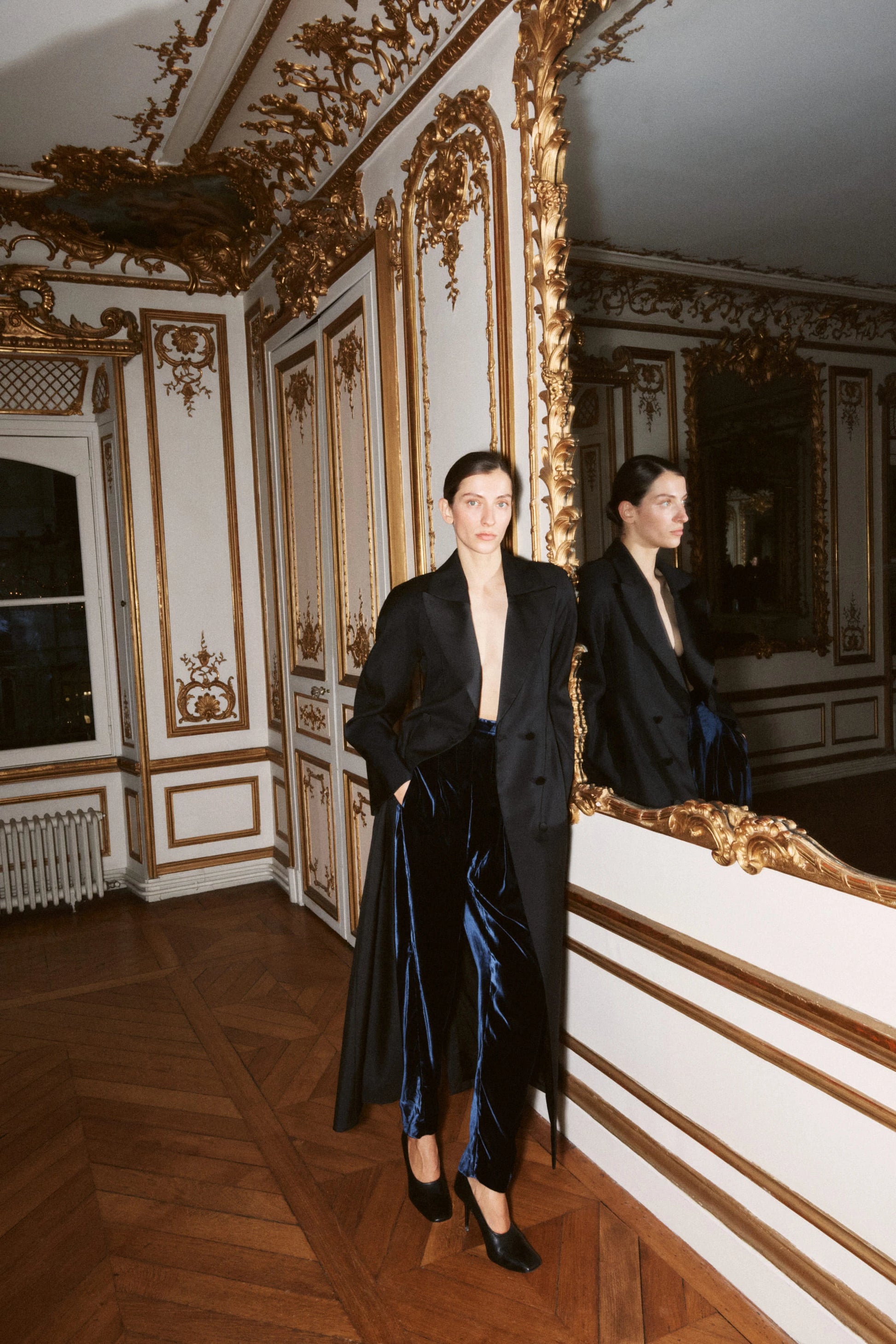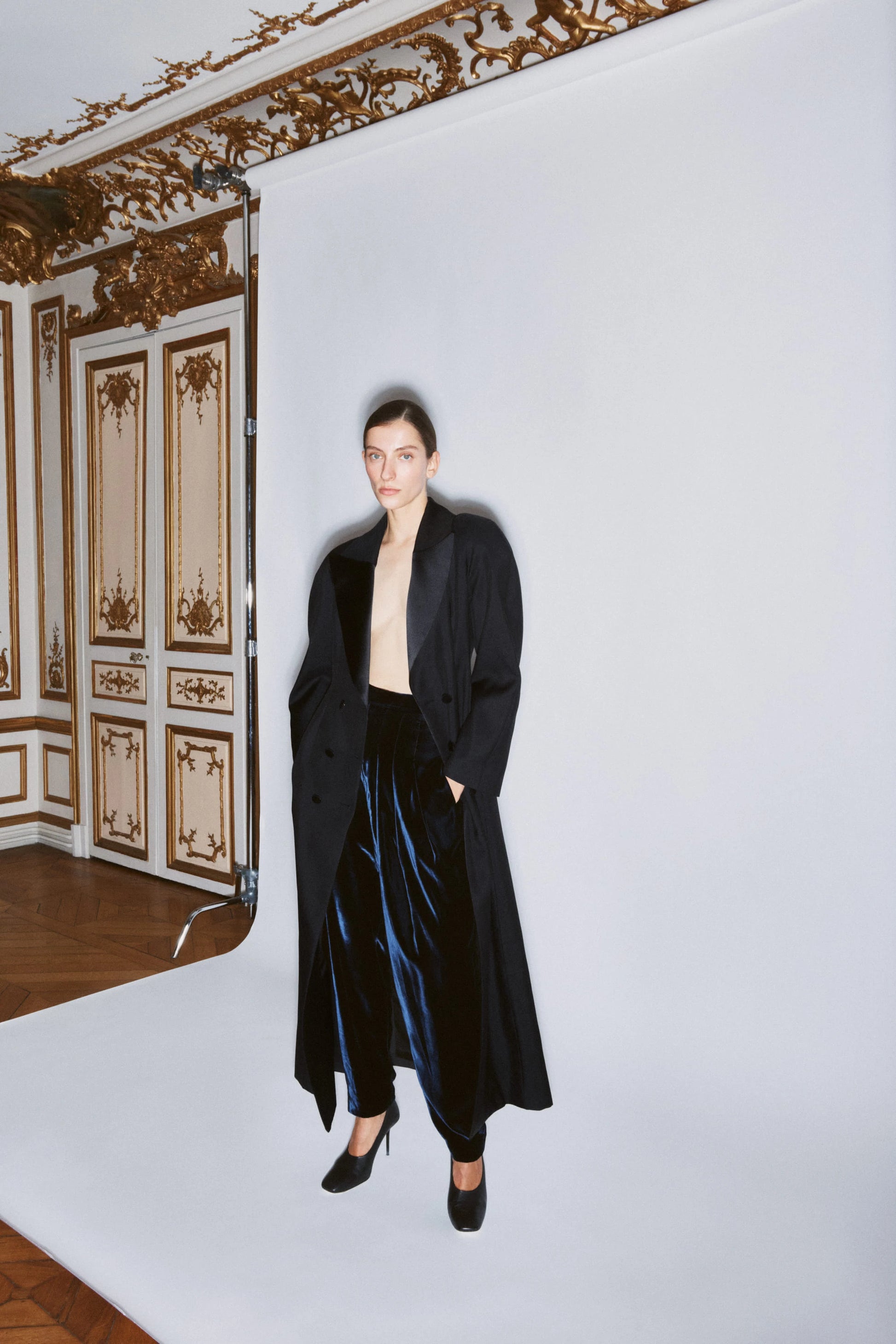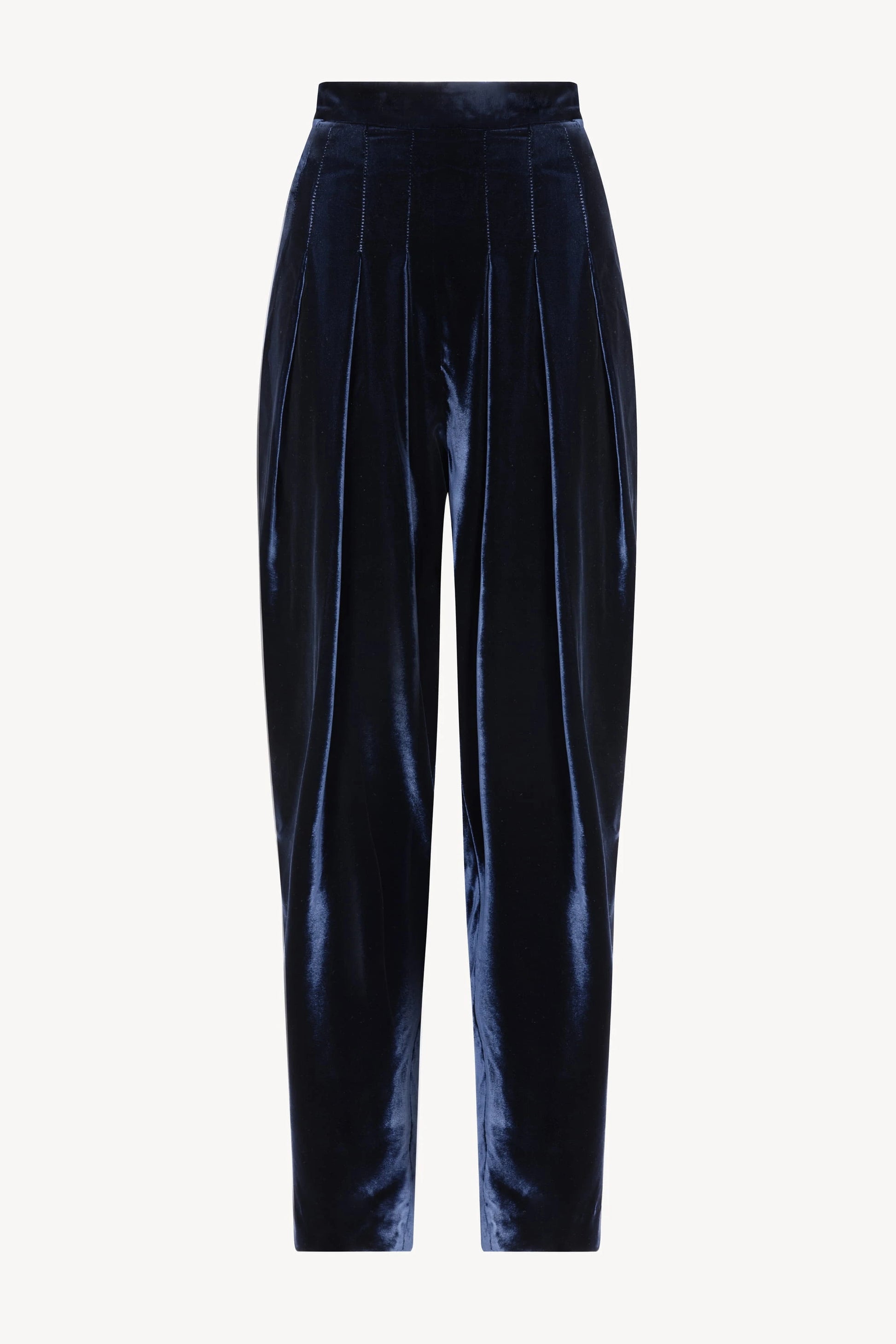 These pleat-front trousers are crafted from delicate Italian viscose/cupro velvet, offering a buttery soft, fluid drape with luxurious sheen. Designed with a balloon silhouette, they feature a cinched waist to define the figure while allowing effortless movement. Invisible zip at centre back.