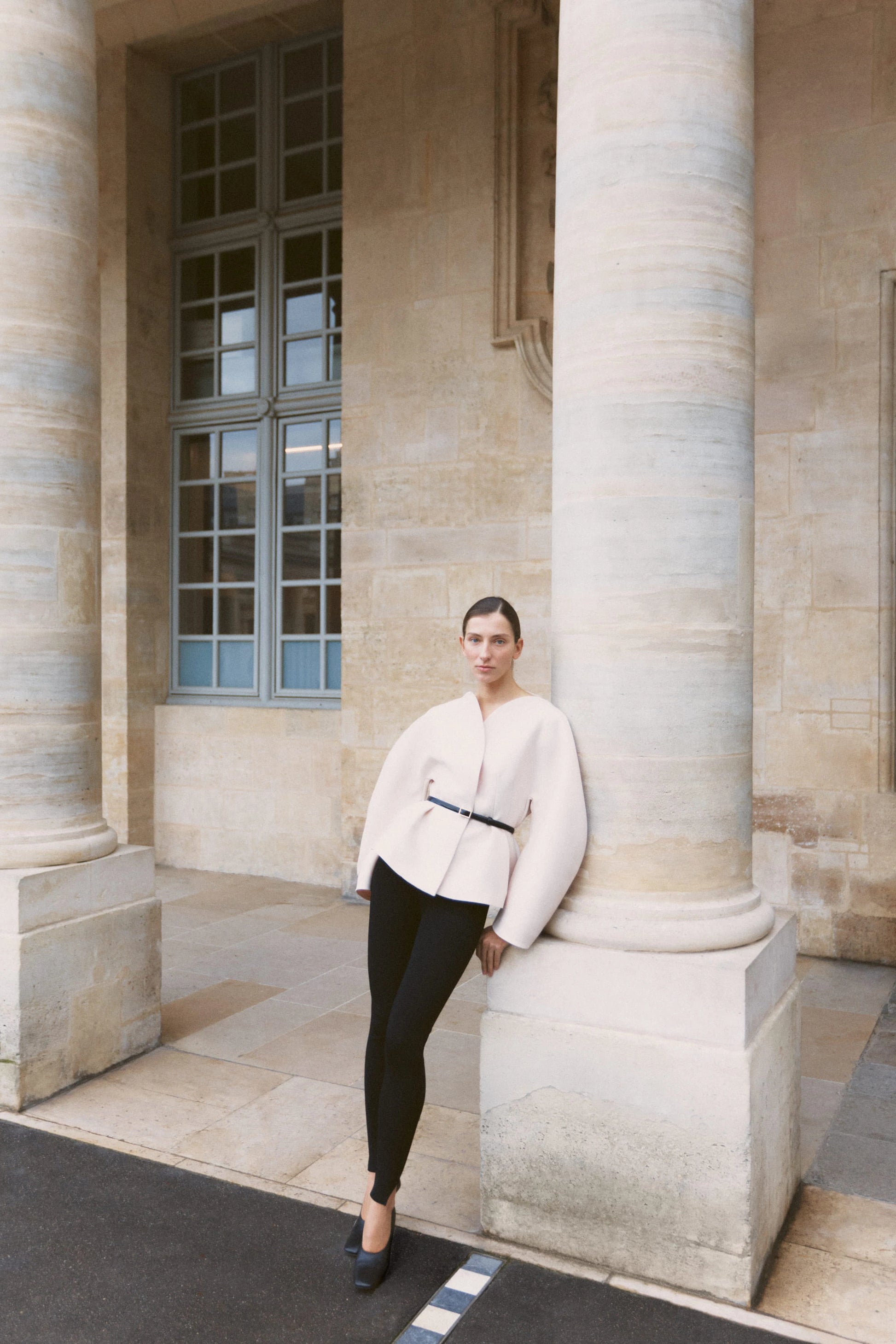 A structured jacket cut from a refined wool/silk blend, designed to hold its shape while remaining soft to the touch. The black lizard-print leather belt cinches the waist and adds dramatic contrast. The jacket is fully lined and has a subtle center front closure with a hidden mother of pearl button.