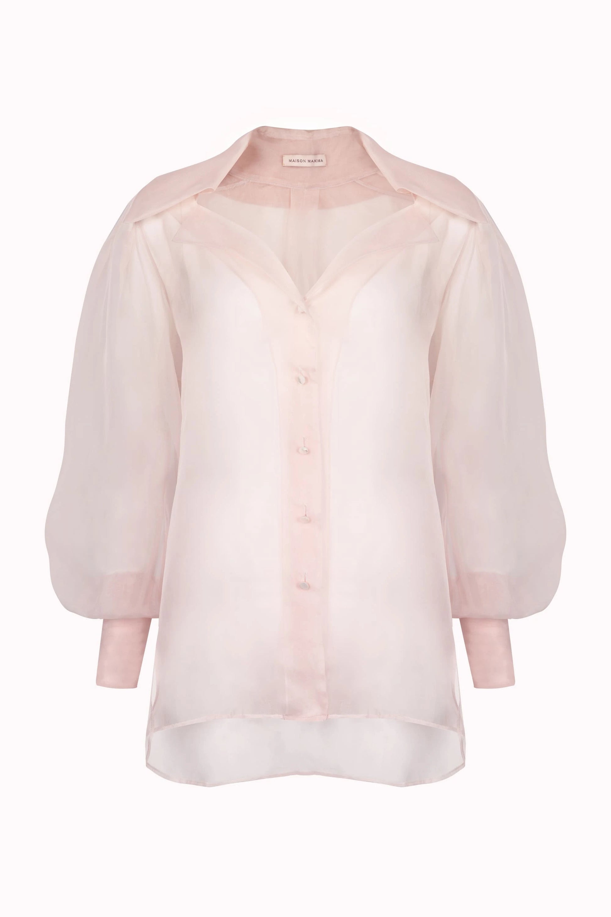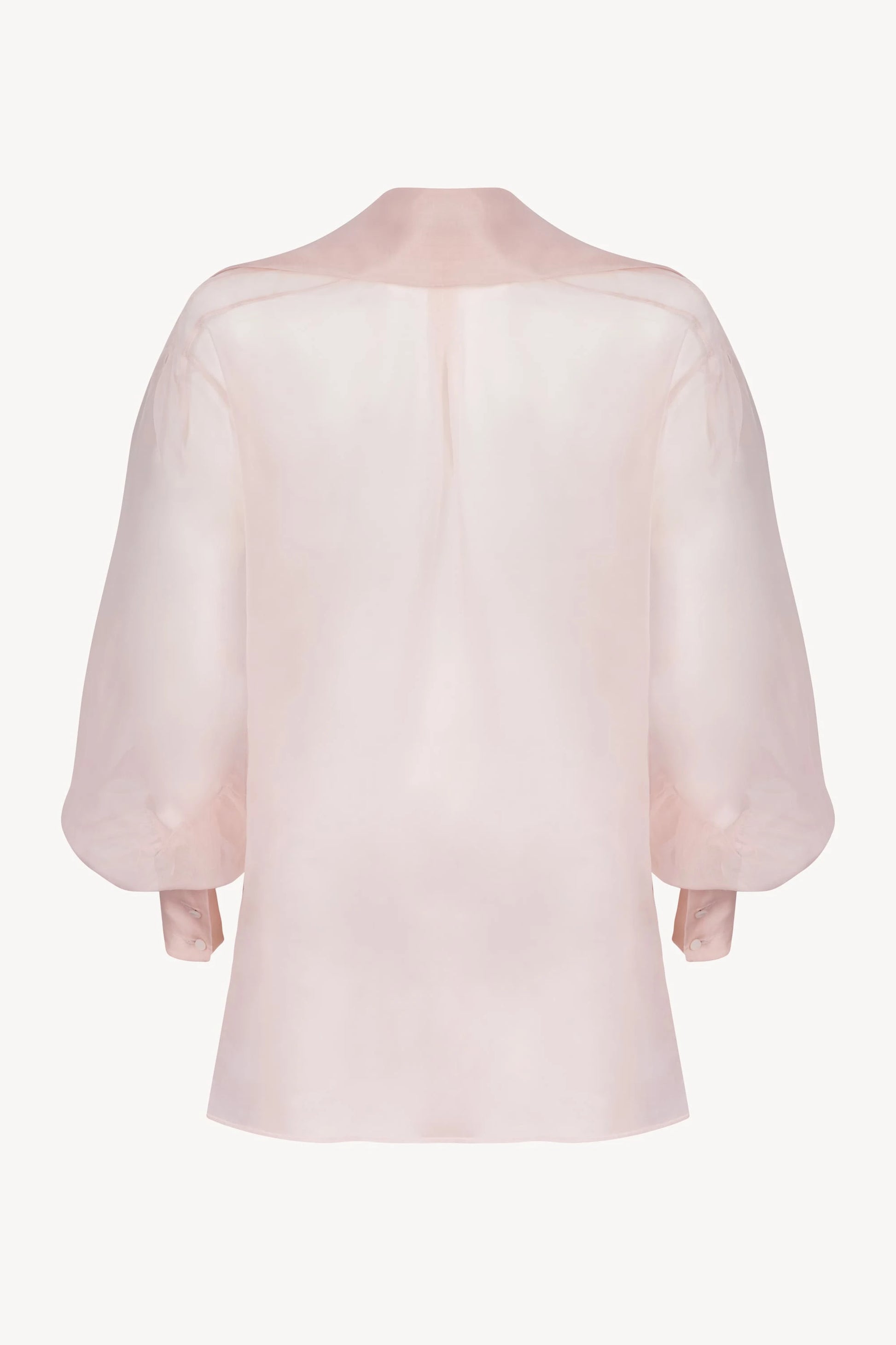 Cut from the finest Italian silk organza, this discreetly transparent blouse balances softness with structure. An elegant open collar frames the neckline, while mother of pearl buttons add a subtle point of luminosity. High cuffs with a four-button fastening complete the silhouette.