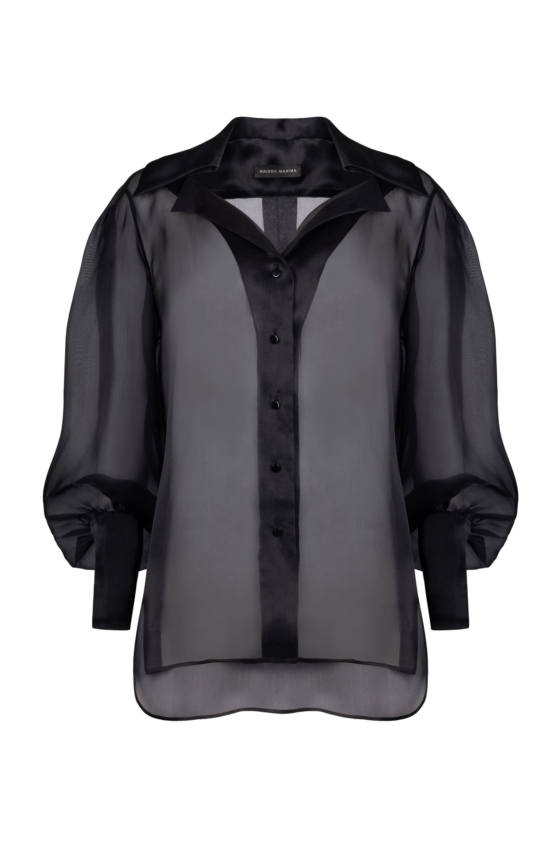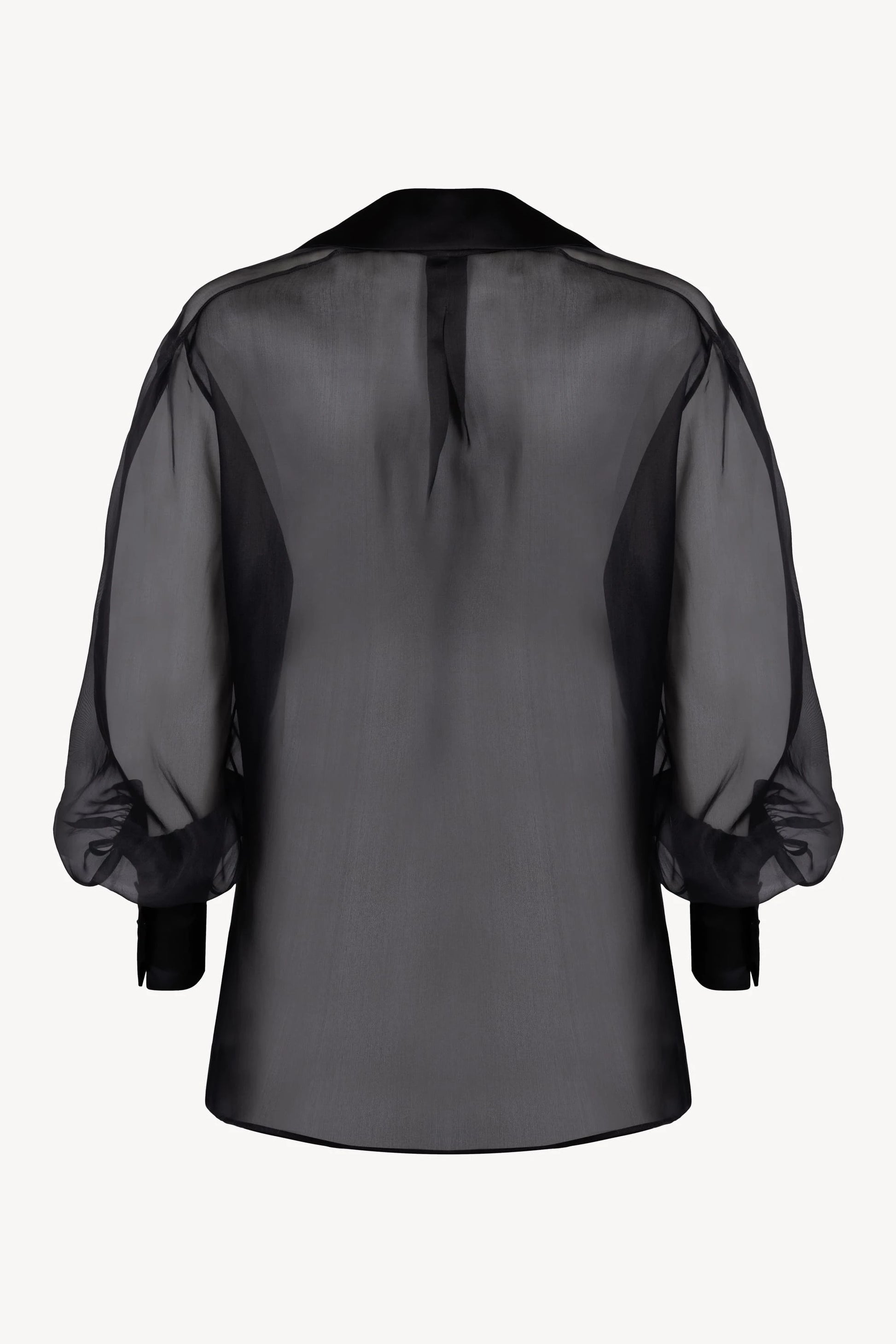 Cut from the finest Italian silk organza, this discreetly transparent blouse balances softness with structure. An elegant open collar frames the neckline, while coated black mother of pearl buttons add a subtle point of luminosity. High cuffs with a four-button fastening complete the silhouette.
